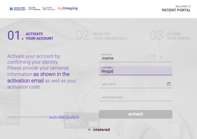 Click on the ‘Activate Account’ link, this will direct you to the myIMAGING Patient Portal where you can complete your registration.